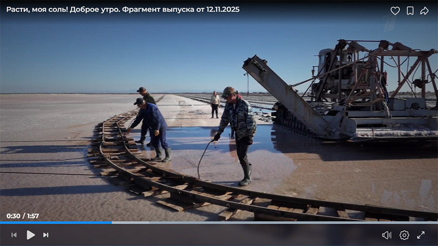 Дальше природа уступает место человеку - в конце августа в высохшие бассейны заходит специальный комбайн, работники вручную делают врезку в пласт, чтобы ножи могли поднять чистую соль, отделяя ее от донного глея. Техника уникальная: комбайн, единственный в своем роде, покинул стены завода-изготовителя еще в 1934 году. Он уже более 80 лет в строю, хотя трудится в агрессивной среде. Поэтому каждый год его перебирают до винтика и чистят.